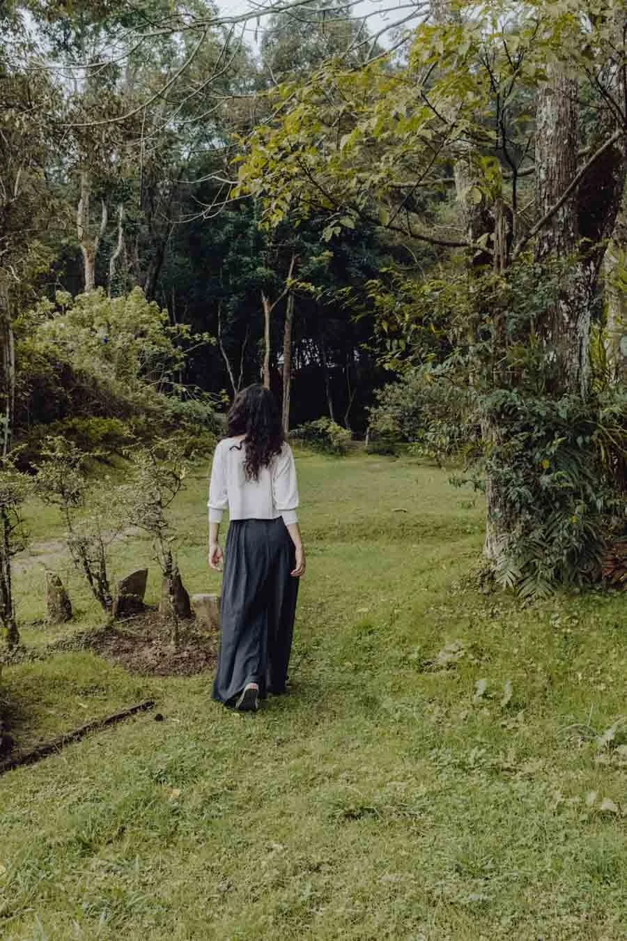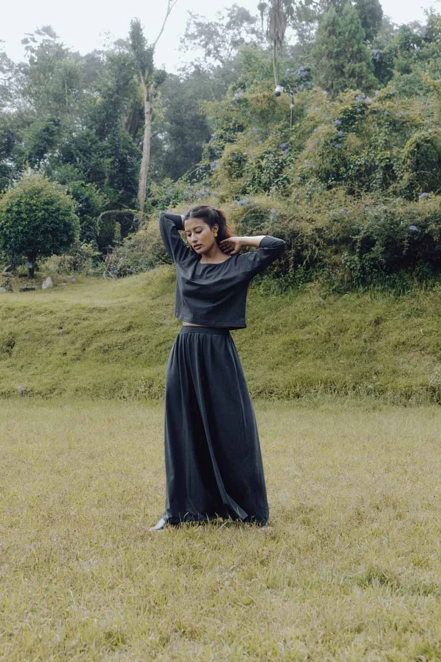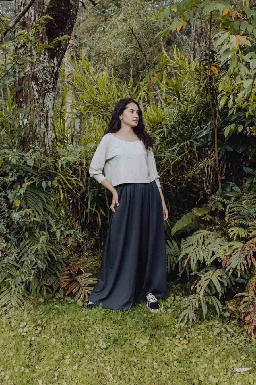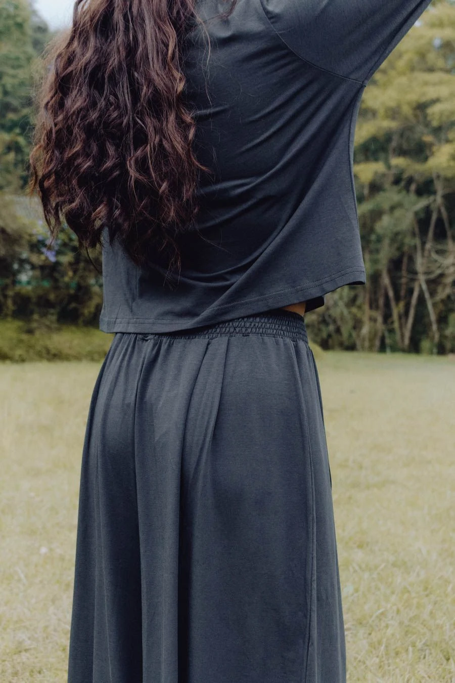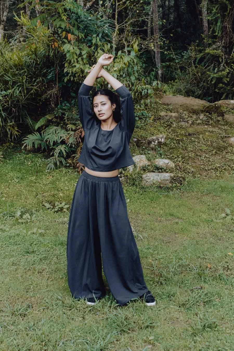 Notre modèle photo, Maya – 1,70m – porte le pantalon large fluide anthracite BASALT.