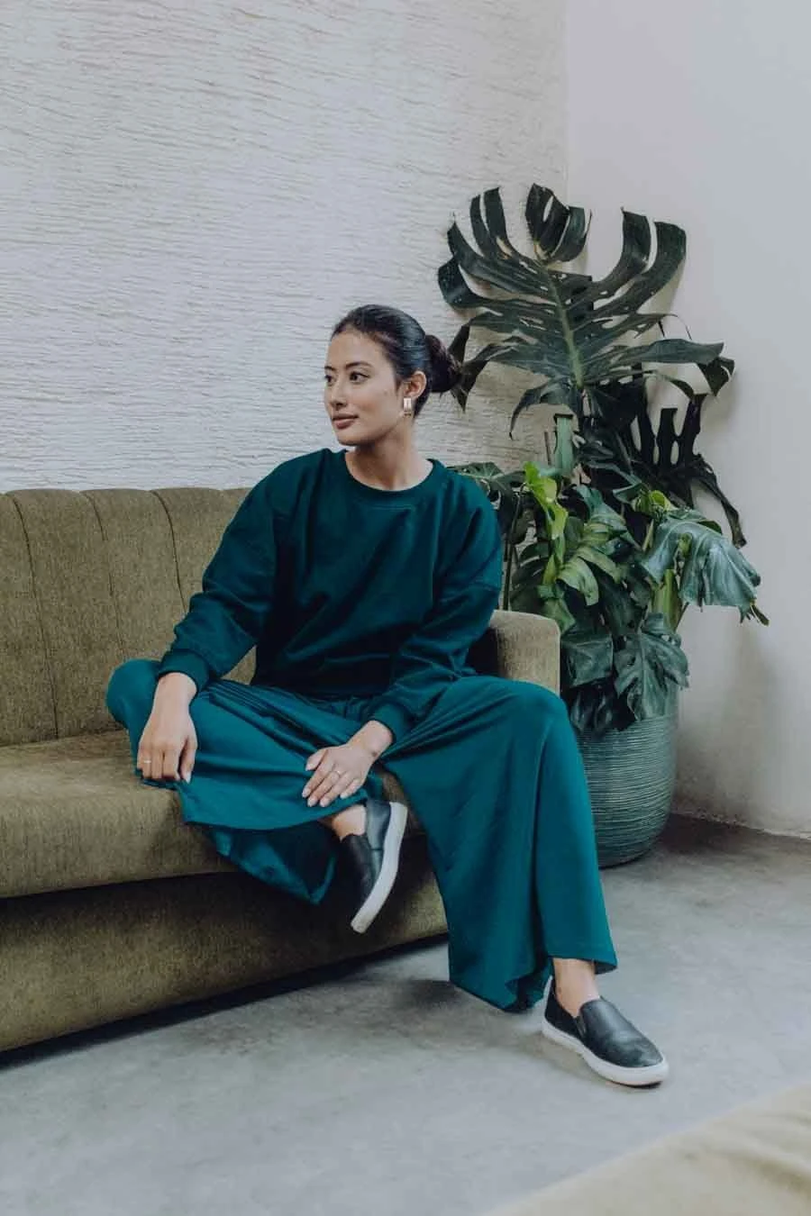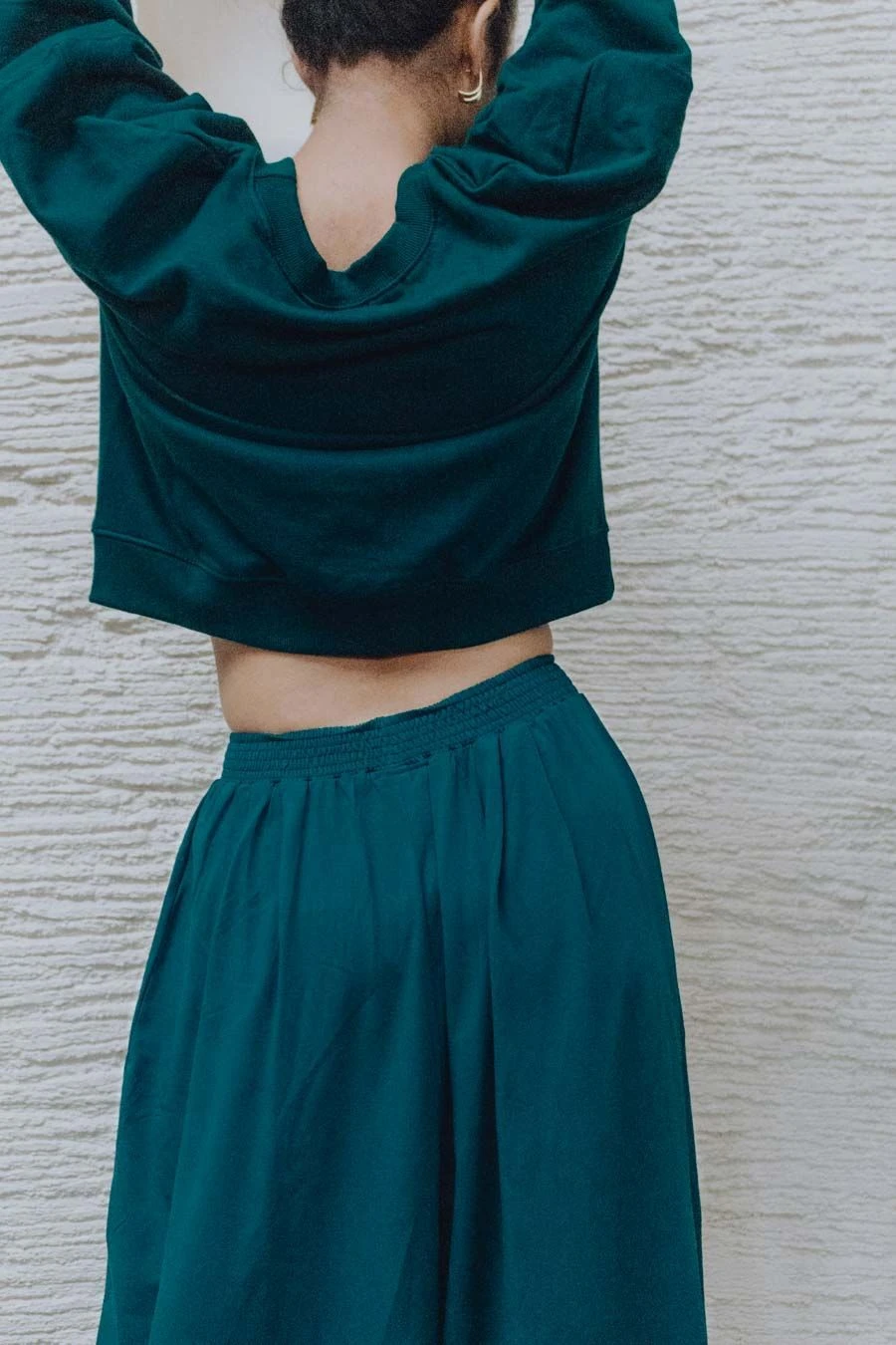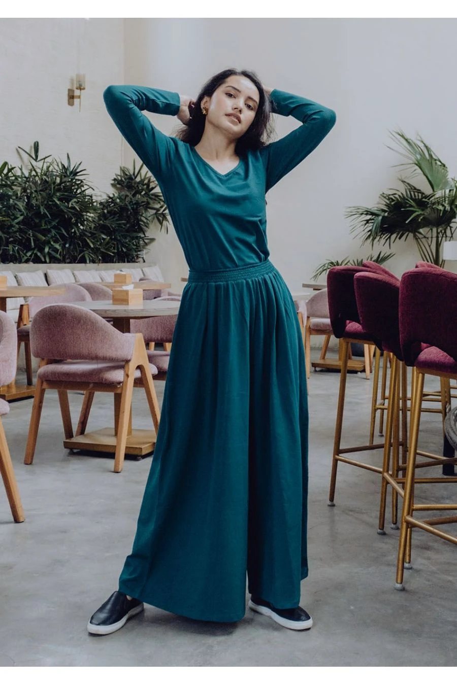 Ce modèle est porté en total look uni avec le T-shirt manches longues ABBIE EMERALD.