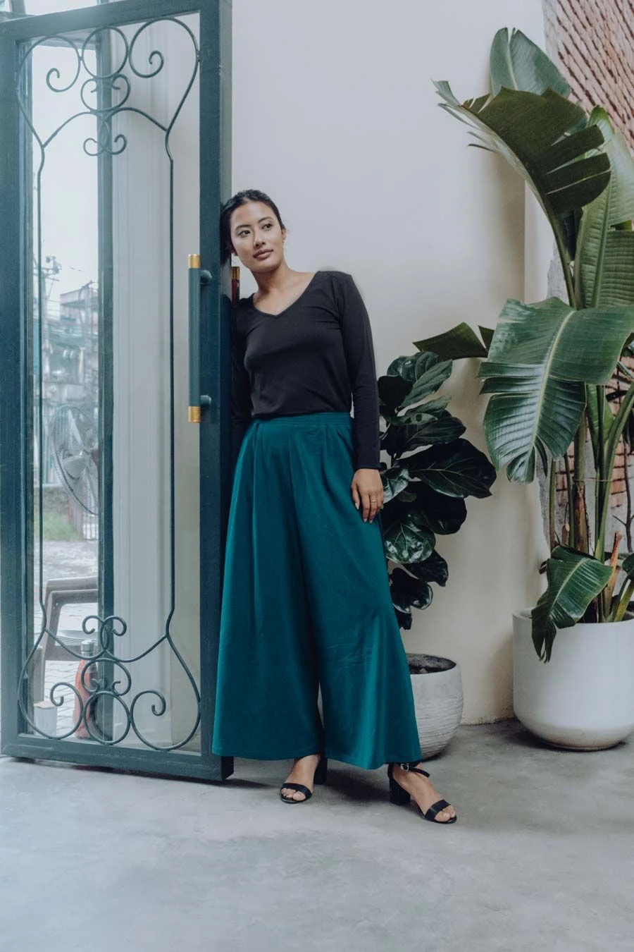 Notre modèle photo, Maya – 1,70m – porte le pantalon large fluide bleu-vert Emerald.
