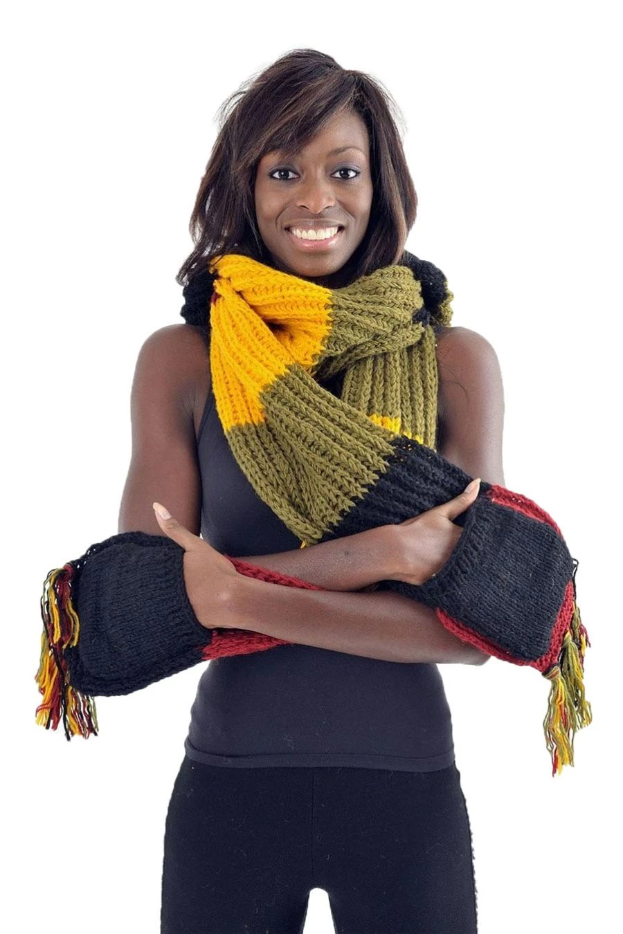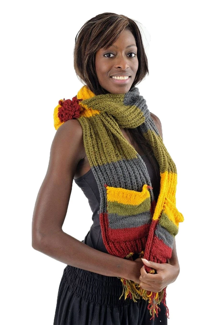 DĂ©couvrez le 3-en-1 capuche-Ă©charpe et poches-moufles multicolore – 100% pure laine douce nĂ©palaise.