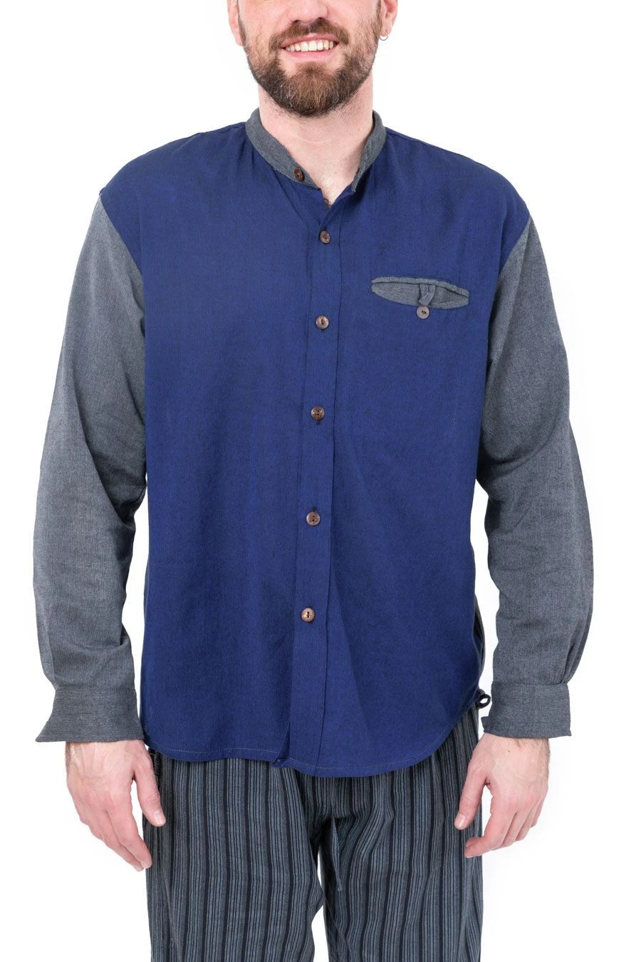 Notre mannequin photo, Mickaël – 1,83m – porte la chemise ethnique en taille M avec le Pantalon japonais rayures zen Lizzoh (réf K3423).