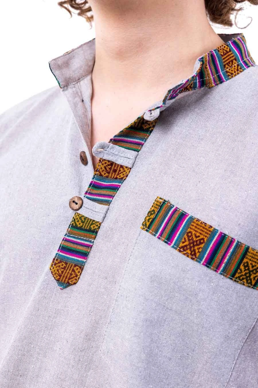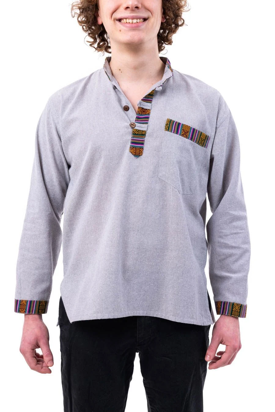 Chemise d’inspiration ethnique avec le col, la poche et les poignets soulignés de broderies traditionnelles du Népal.