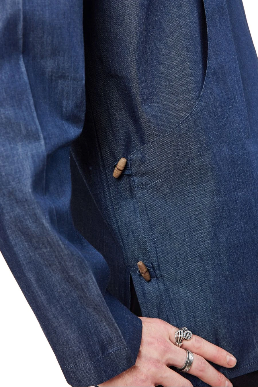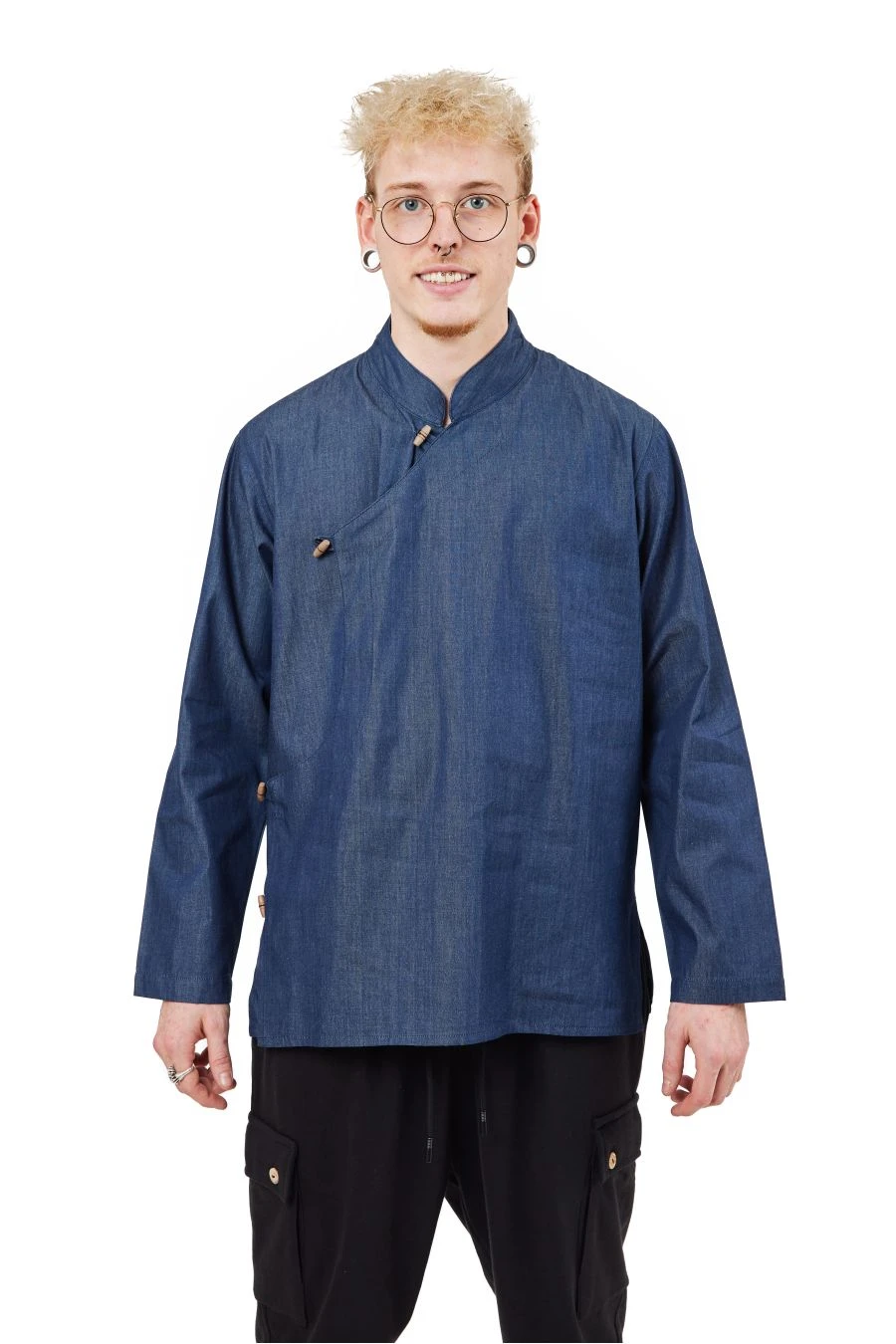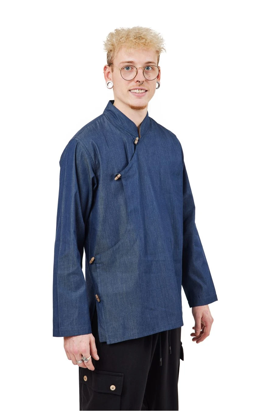 Chemise d’inspiration tibĂ©taine Ă ouverture latĂ©rale en jean fin et souple idĂ©ale aussi en sur chemise : manches et coupe amples, col mao lĂ©gèrement montant et boutons en coco pour un style ethnique très urbain.