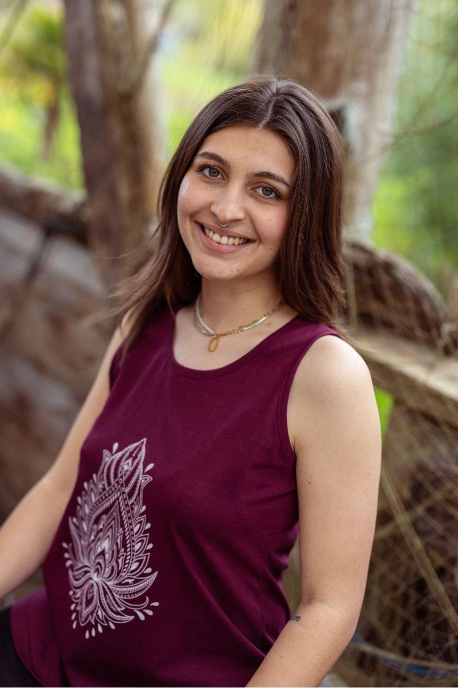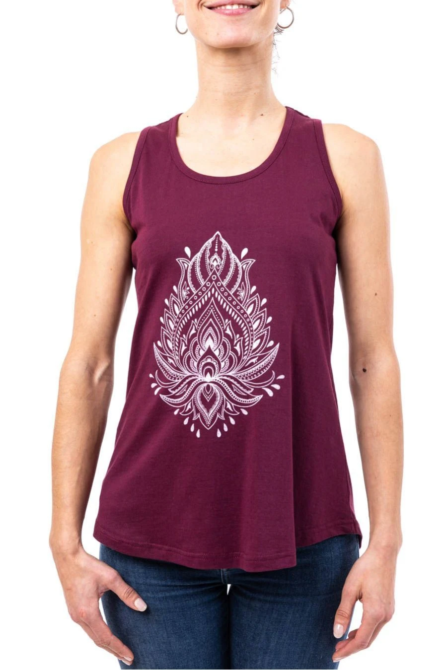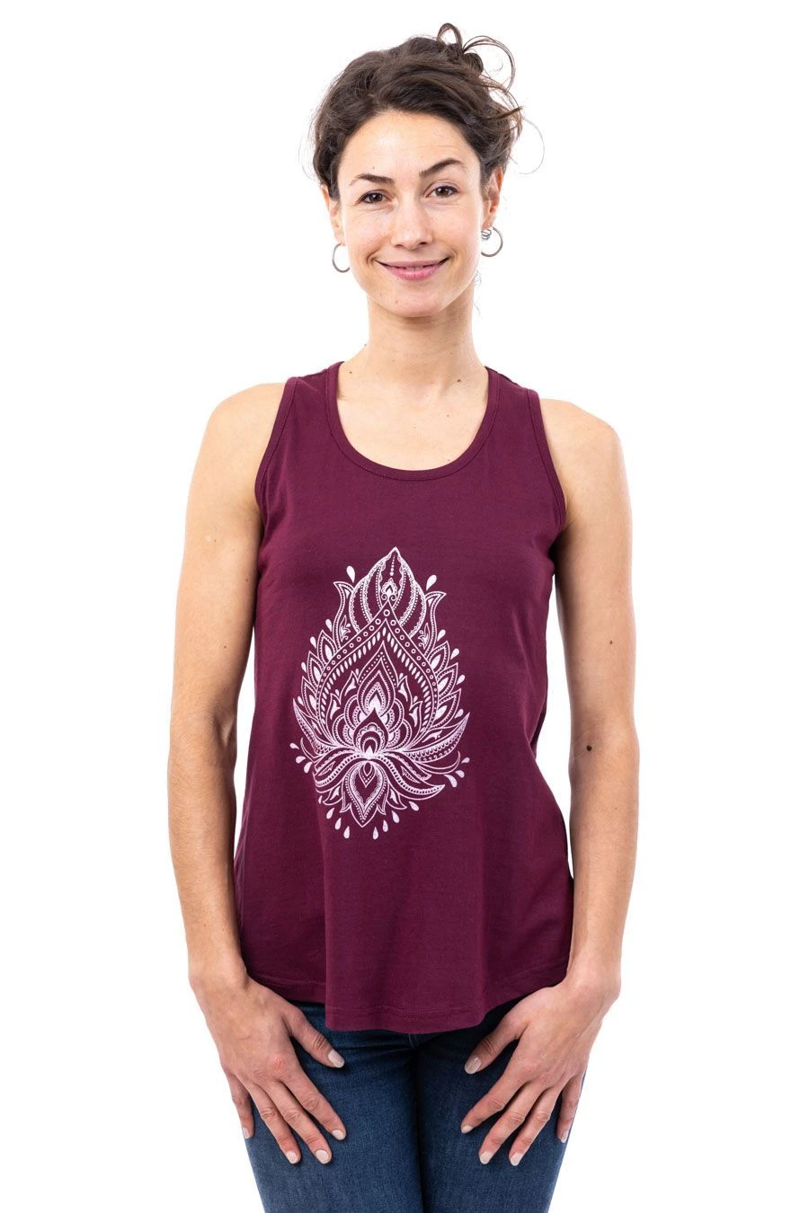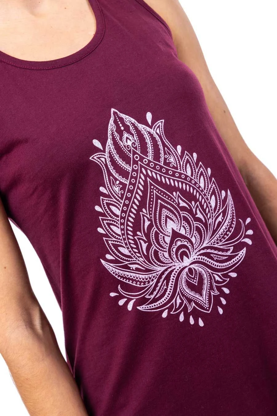 Débardeur long à l’imprimé lotus devant qui contraste en douceur pour illuminer ce modèle un peu plus long au dos. Tissu doux légèrement extensible et coupe ample fluide confortable.