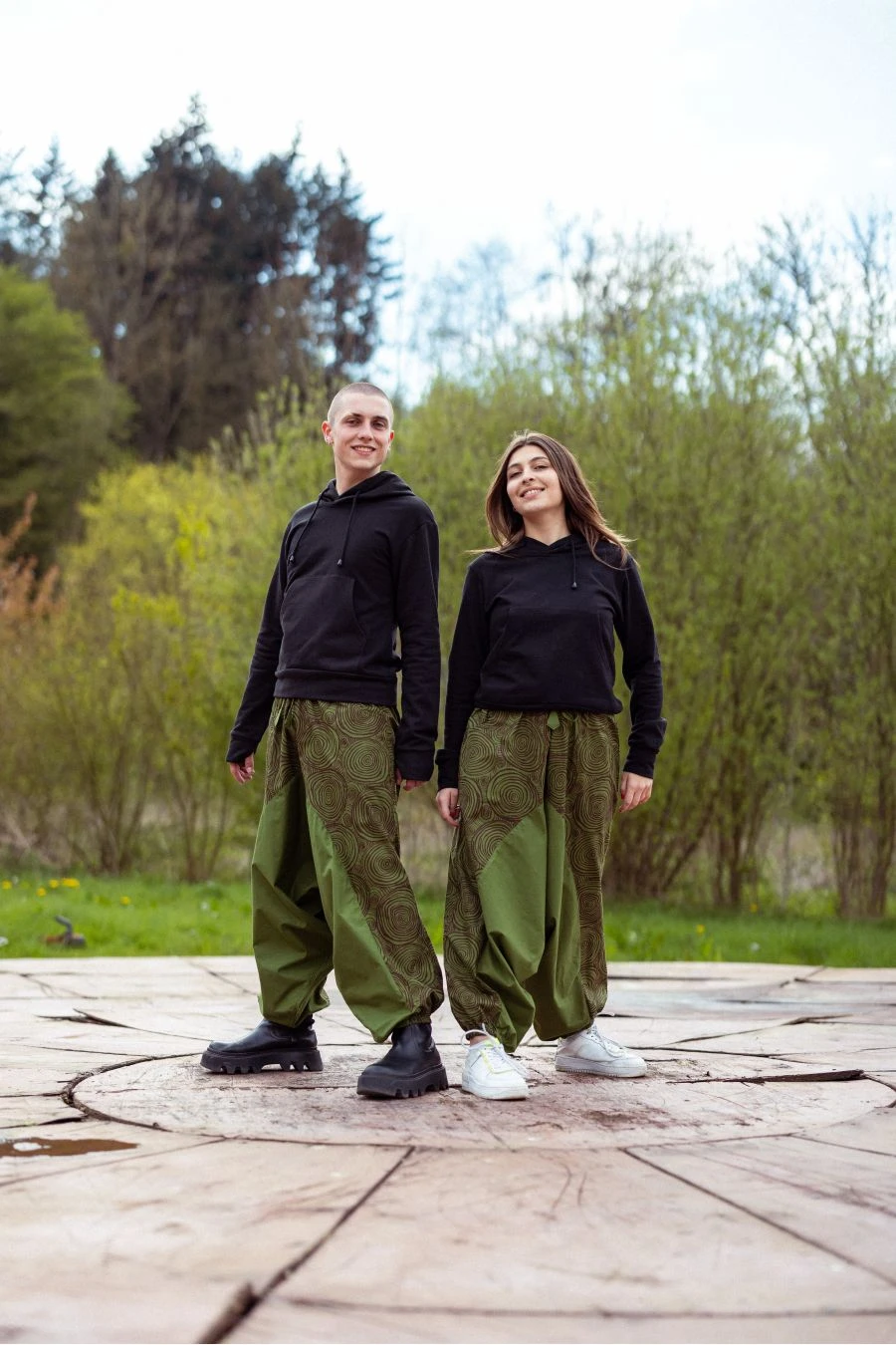 Nos mannequins photos, Luccia – 1,64m – et Youri – 1,75m – portent le sweat molleton Ă capuche en taille M (36-38) avec le Sarouel hip hop mixte hiver Teos.