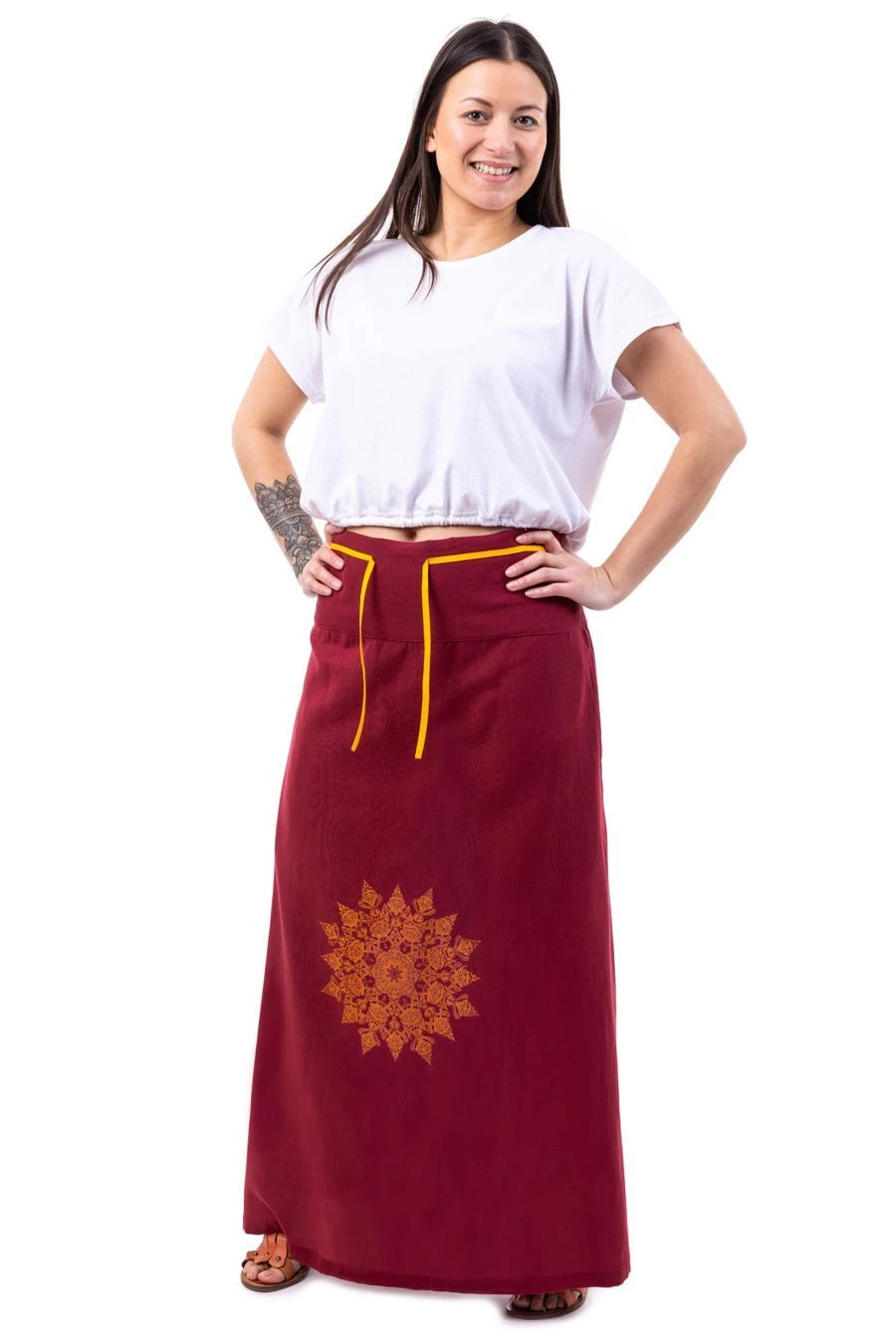 - Coloris : Rouge bordeaux, jaune d’or et imprimé mandala orangé devant