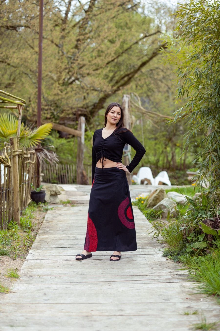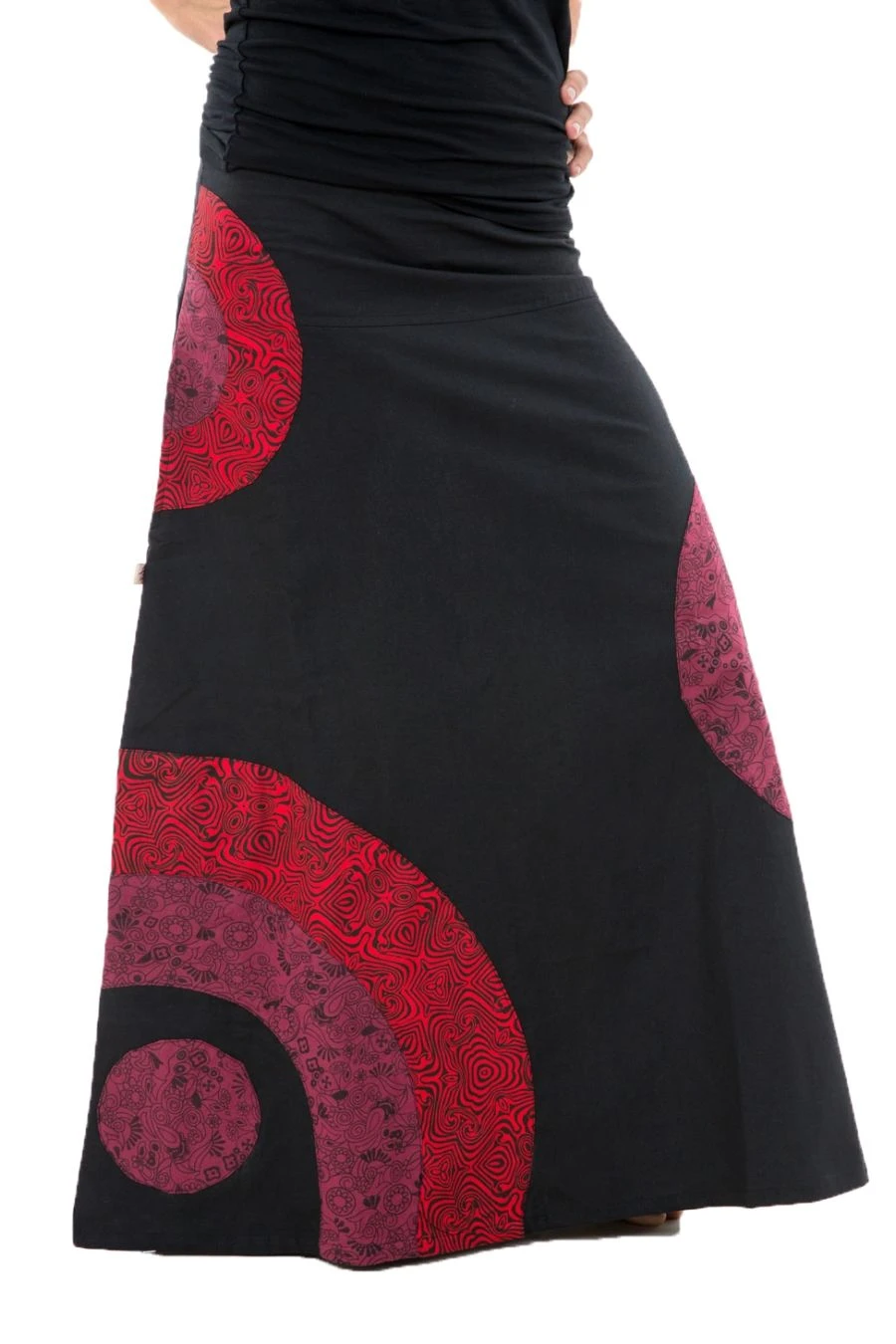 Jupe longue psychedelic nepali dream noir rouge hiver – FZ1811 – 100% pur coton épais du Népal. Mi saison automne hiver.