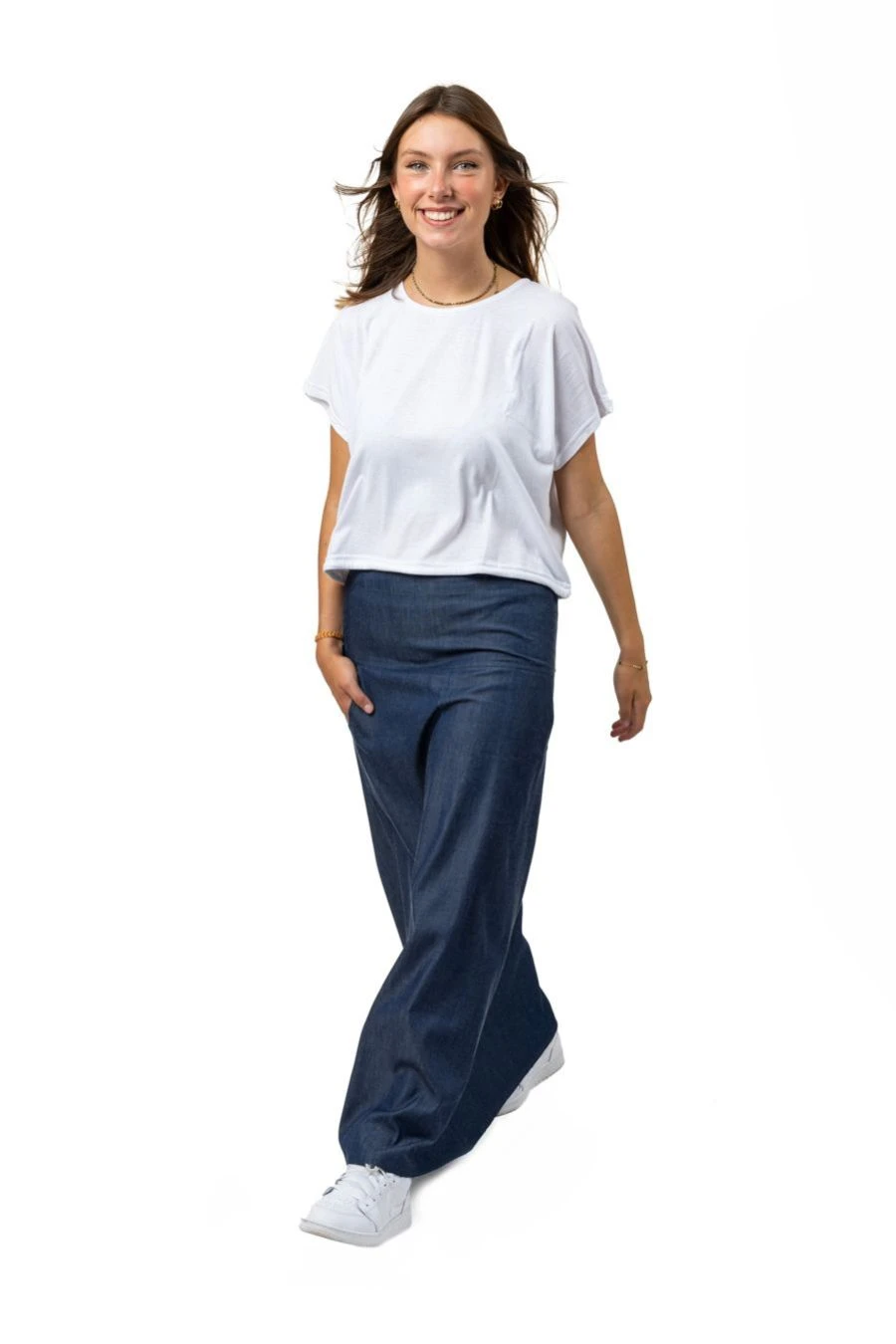 Notre mannequin photo, Luccia – 1,64m – porte la jupe longue en jean éthique en taille M (36-38) avec le T-shirt blanc transformable Kohachella.