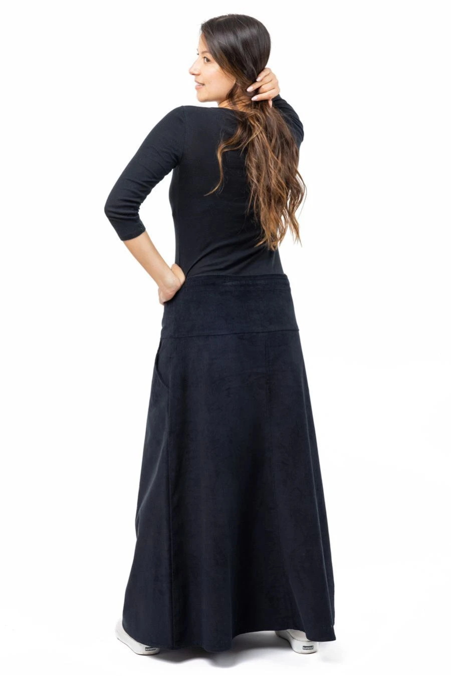 Notre mannequin photo, Carolane – 1,70m – porte la jupe longue en taille L (40-42).