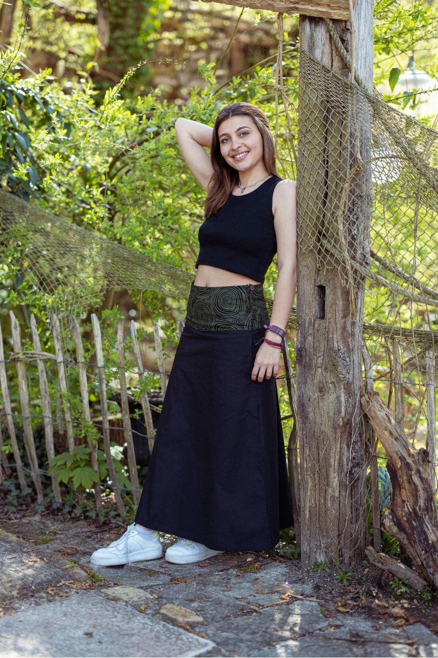 Notre mannequin photos, Anaïs – 1,65m – porte la jupe en taille S avec le Débardeur crop-top côtelé Raven en taille S.