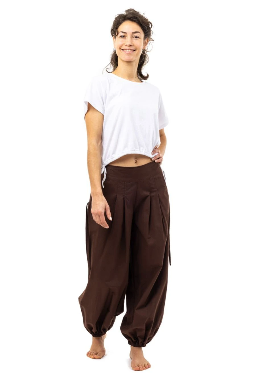 Idéal pour femme comme pour homme, ce pantalon aladdin bouffant peut se transformer en pantacourt ou bermuda grâce à un système de fronce de chaque côté. Un basique à porter dès le printemps jusqu’à l’automne !