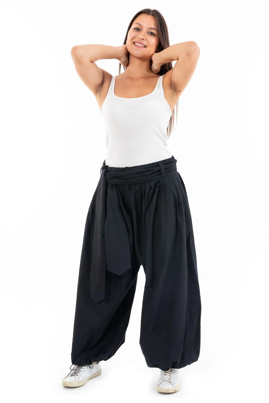 Notre mannequin photo, Carolane -1,70m – porte le sarwel en taille L (40-42).