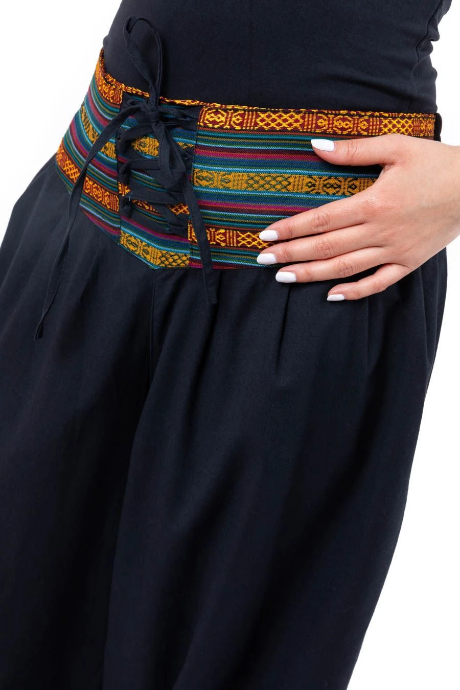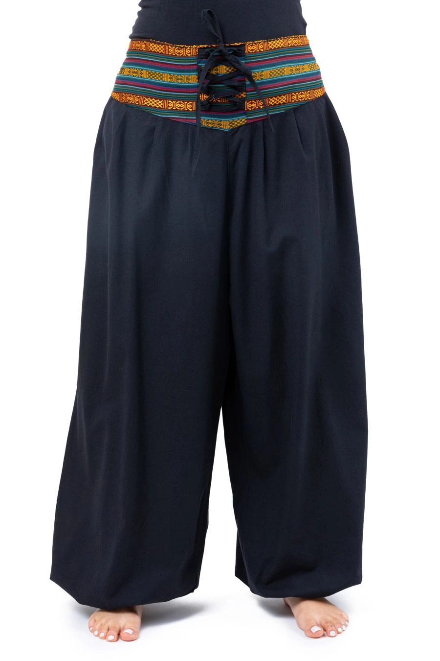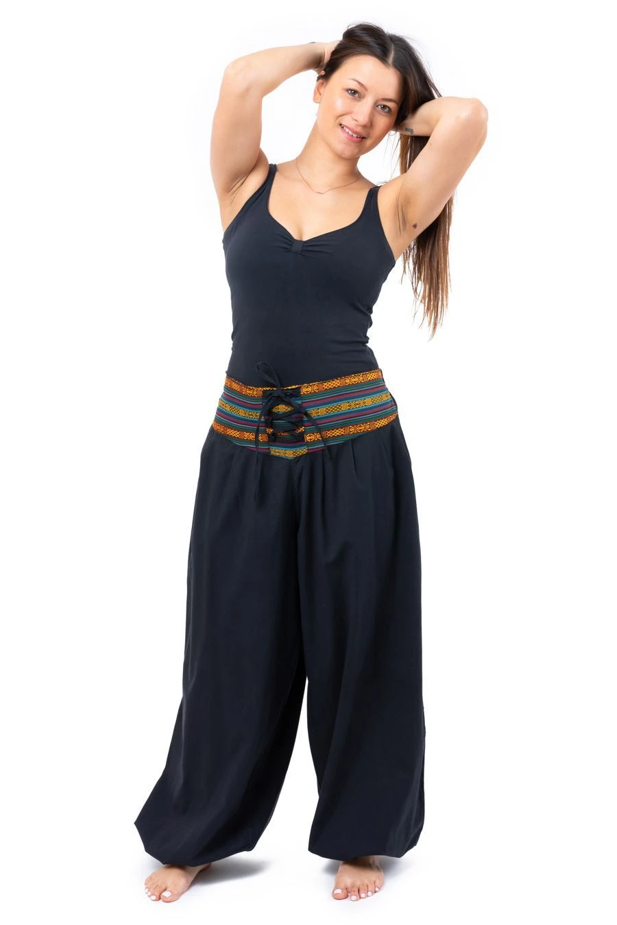 Pantalon bouffant large au style ethnique, une touche chic et féminine avec la ceinture corset et un joli tissu traditionnel népalais, il saura vous habiller tout en légèreté et en élégance.