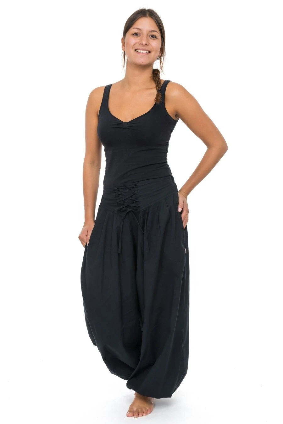Pantalon ethnic ceinture corset noir Bliza – K2008 – 100% pur coton Ă©pais du NĂ©pal.