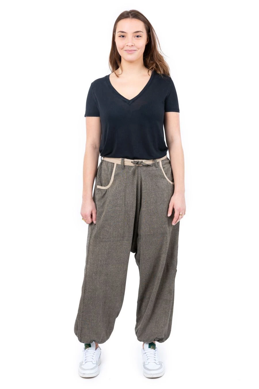 Guillaume -1,83m – et Astrid – 1,71m – portent le pantalon sarouel Beige chanvre chiné foncé (K2641).