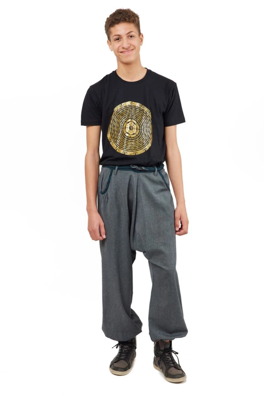 Noah – 1,83m – et Carolane – 1,70m – portent le pantalon sarouel Gris chiné foncé et rayures bleu canard et noir (K3631).