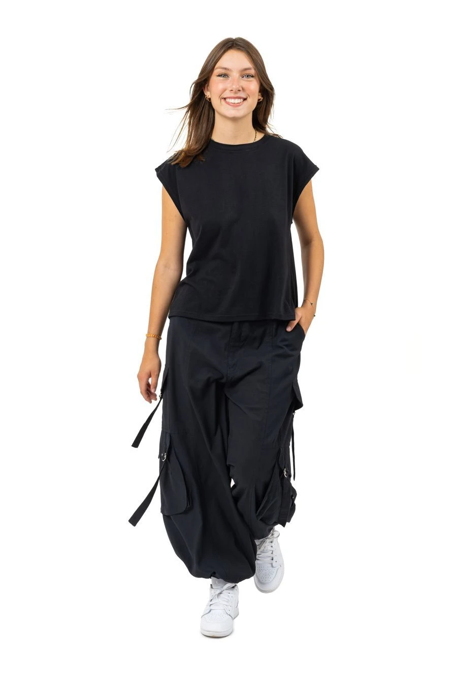 Nos mannequins photos : Luccia – 1,64m – porte le pantalon cargo noir avec le T-shirt femme original dos ouvert Hululeh ; et Valentin – 1,75m – porte le pantalon cargo à poches ; tous les deux en taille M.