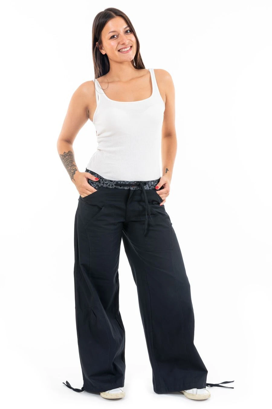 - Liens coulissants cheville à serrer, ou non, pour un effet bouffant ou droit