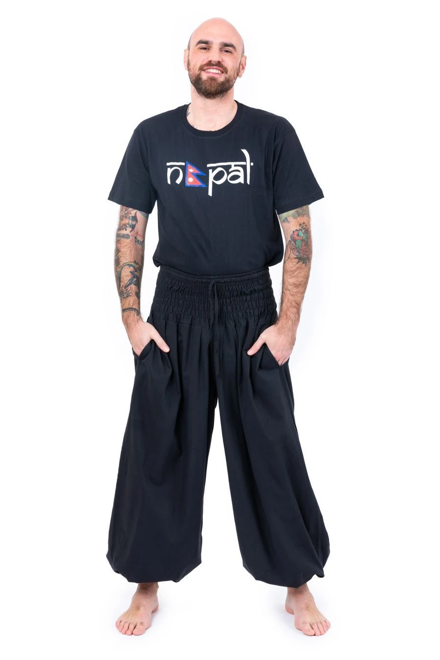 Nos mannequins photos : Carolane – 1,70m – et Mickaël – 1,83m – portent le pantalon bouffant noir uni. Nora – 1,65m – porte le pantalon bouffant noir-kaki.