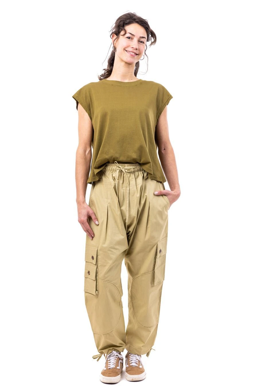 Esprit baroudeur des villes ou des champs, on aime ce pantalon sarouel mixte style cargo pratique avec ses nombreuses poches. Avec une chemise, un T-shirt ou un crop-top ; avec des tongs, mules, sneakers ou boots ; urbain, campagne ou en festival, il s’adapte à tous les environnements et tous les styles.