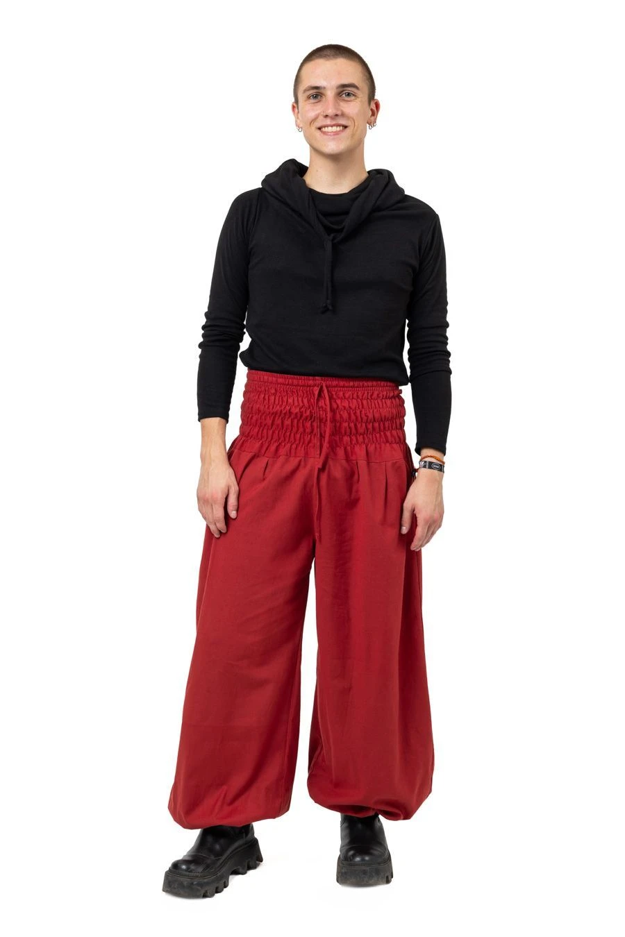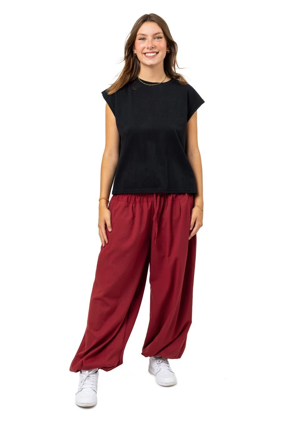 Taille unique, notre pantalon mixte en bordeaux, fluide, lĂ©gèrement sarouel et bouffant, s’adapte du 36 au 50 grâce Ă sa ceinture bandeau Ă©lastique.
