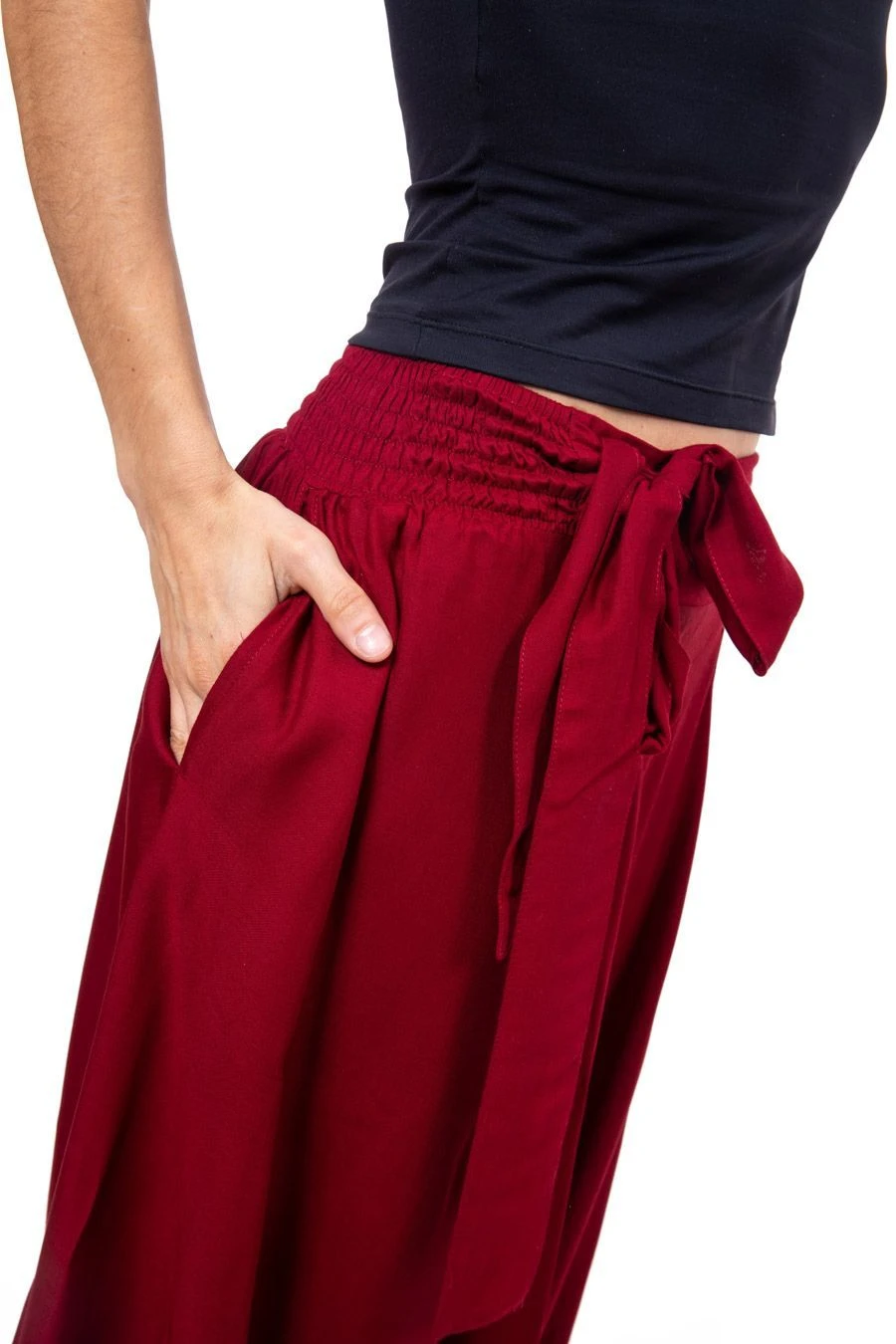 Nos mannequins photos : Anaïs – 1,67m – porte le sarouel doux et fluide couleur bordeaux en taille S.
