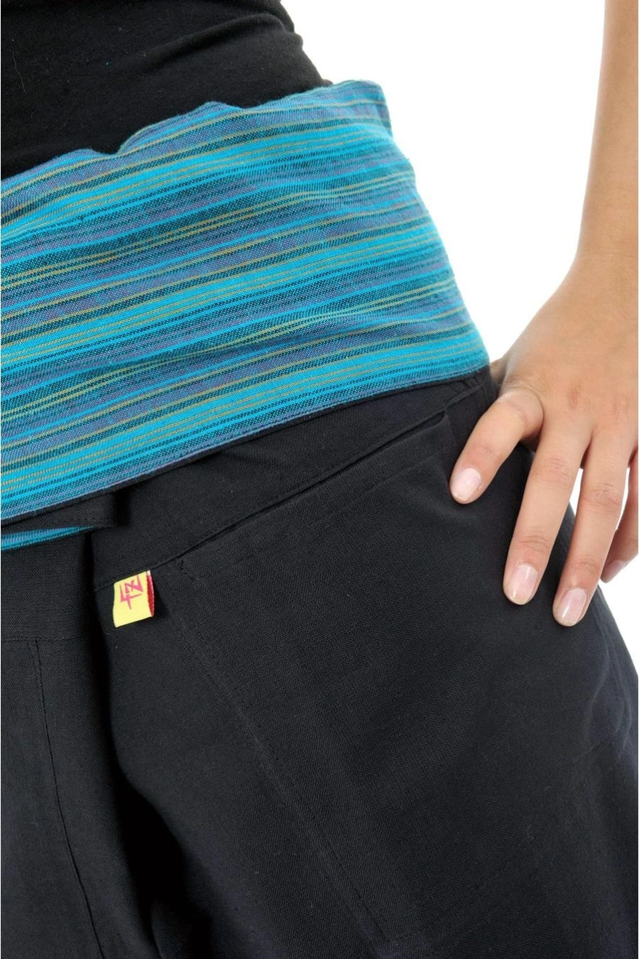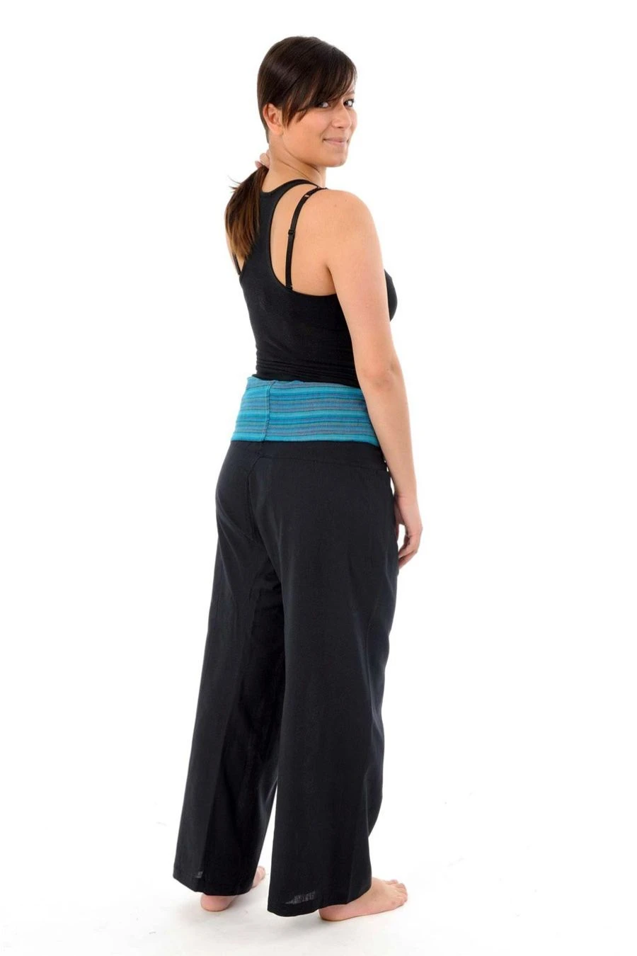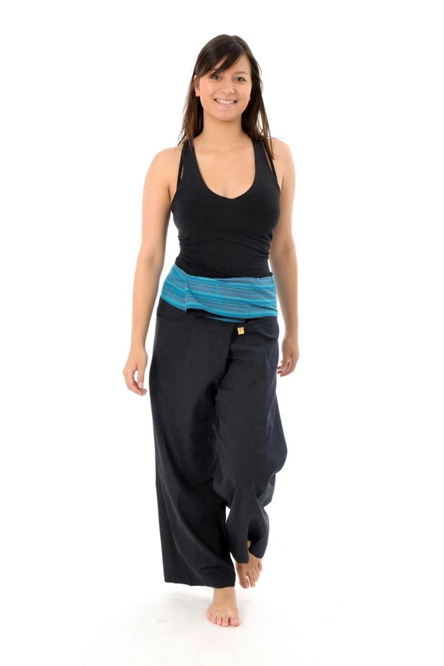 | Pantalon pêcheur Thaï noir rayure turquoise K1 – 100% pur coton léger du Népal. Taille unique. Notre mannequin, Carolane, mesure 1,70 m. Envie de + de couleurs et modèles de pantalon thai ?Recommandé dans « Elle Magazine »Mode d’emploi du Pantalon Thaï Fisherman en vidéo |