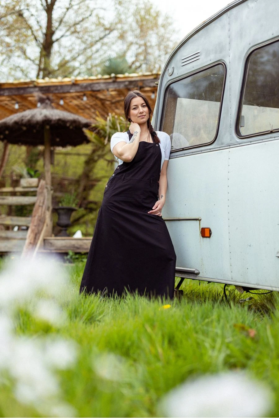 Notre mannequin photo, Carolane – 1,70m – porte la robe salopette noire en taille L (40-42) et la salopette robe kaki en taille M (36-38).