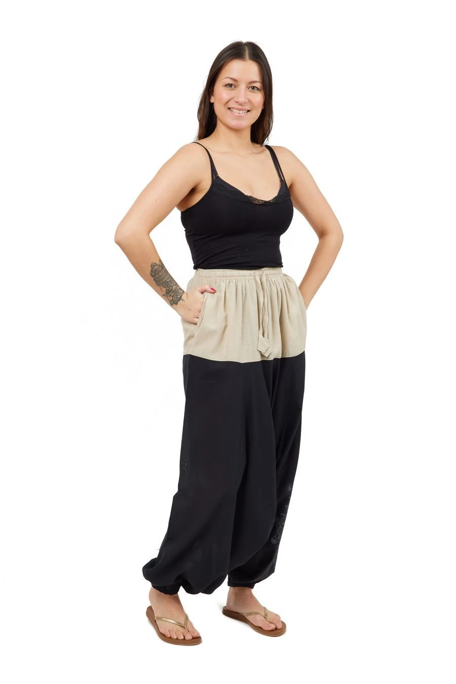 Nos mannequins photos : Carolane – 1,70m – et Timothée – 1,83m – portent respectivement le sarouel en taille M (36-38) et L (40-42).