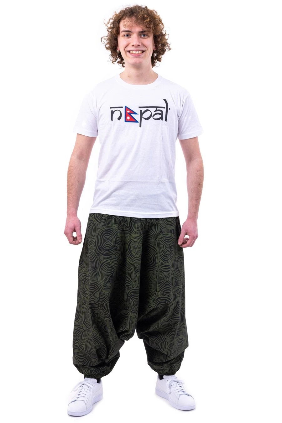 Nos mannequin photos : Luccia – 1,64m – avec le Débardeur crop-top côtelé Raven en taille M, et François – 1,75m – avec le T-shirt homme Népal en taille M, portent habituellement la taille M (36-38) en pantalon sarouel.
