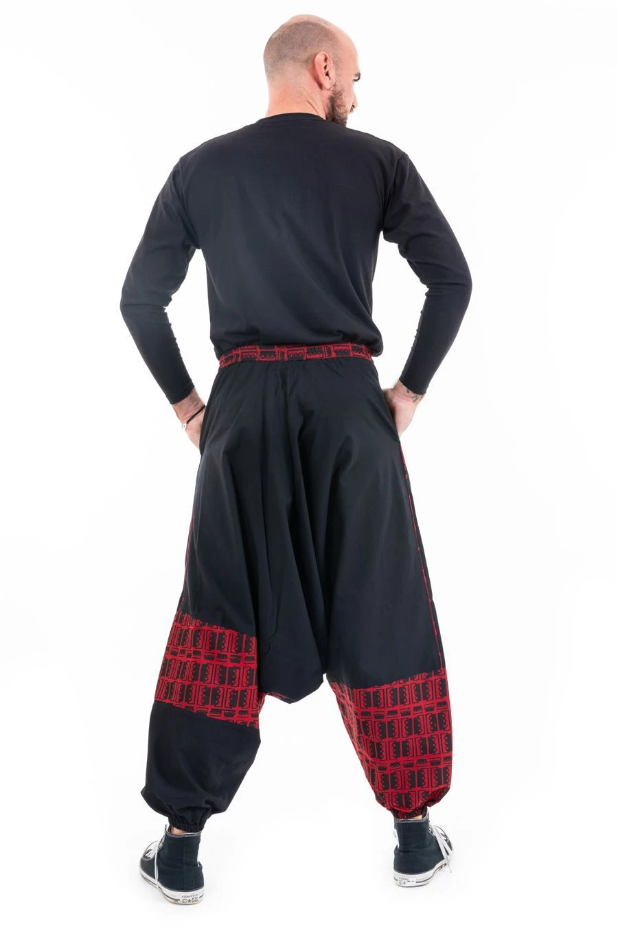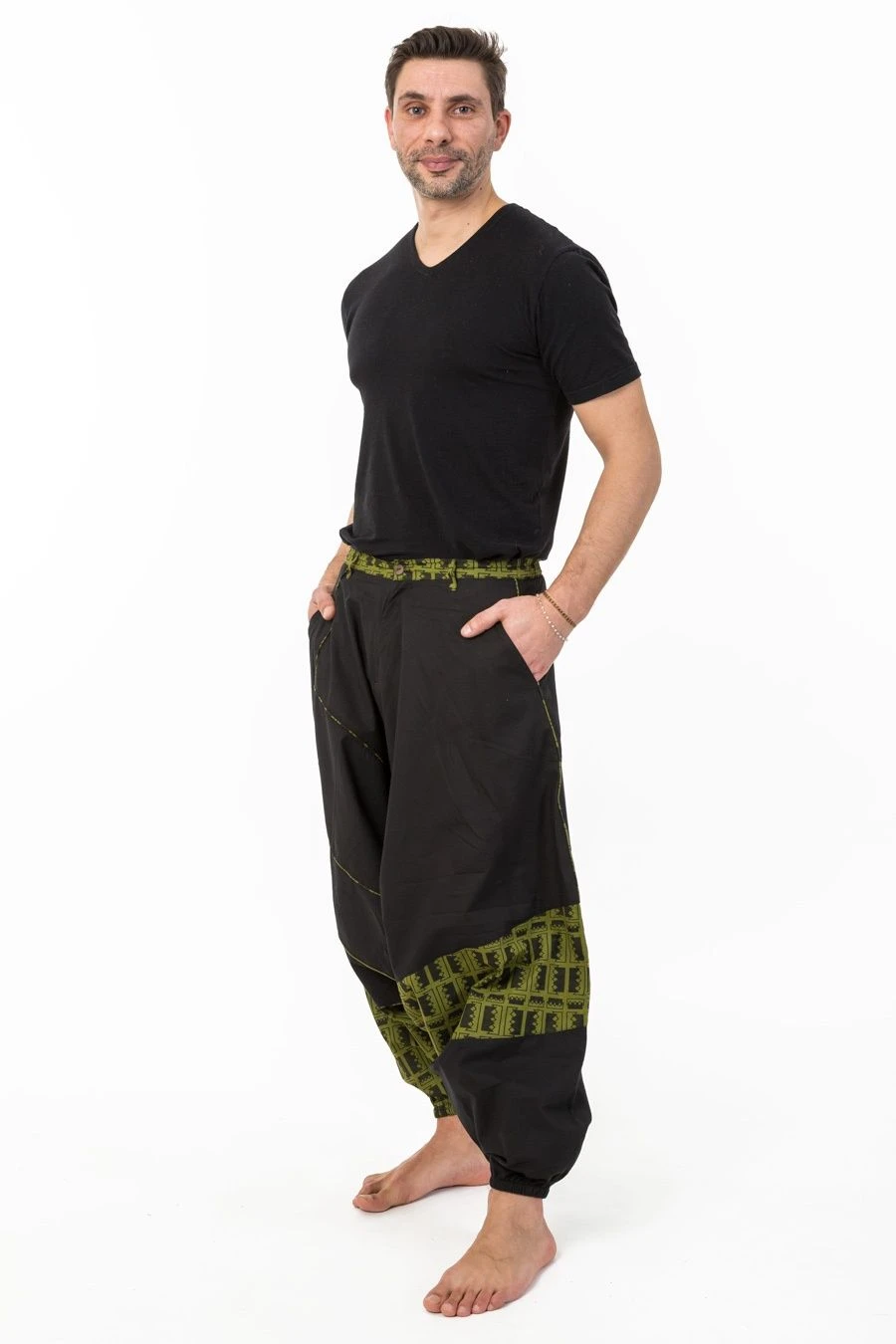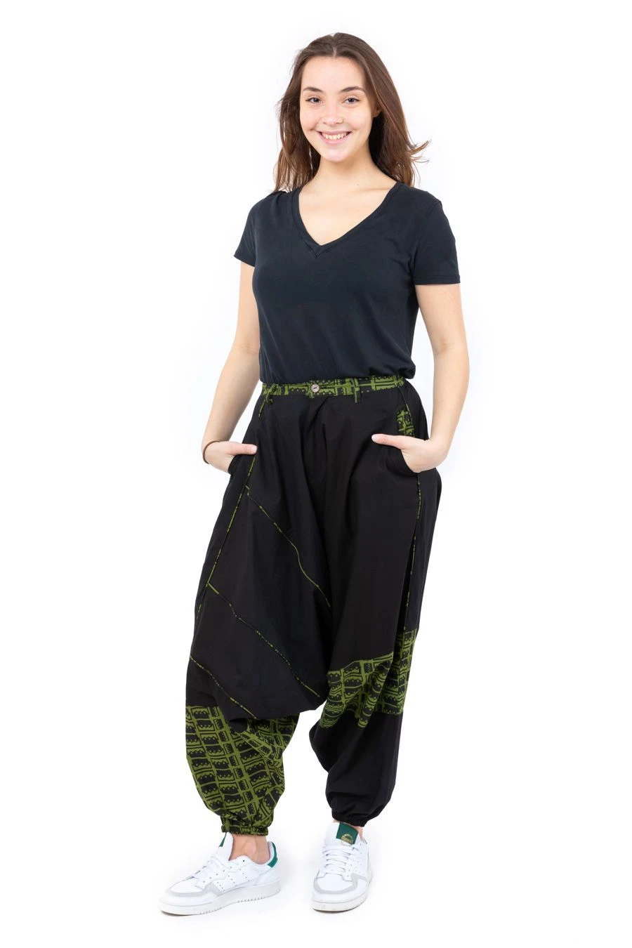 Nos mannequins photos : Guillaume – 1,83m – porte le sarouel noir et kaki en taille L (40-42) et Astrid – 1,71m – en taille S ; Mickaël – 1,83m – porte le sarwel noir et rouge en taille L.