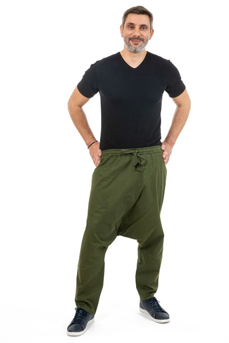 Nos mannequins photos : Guillaume – 1,83m – porte le sarouel ethnique en taille L ; Astrid – 1,71m – porte le sarouel en taille S.