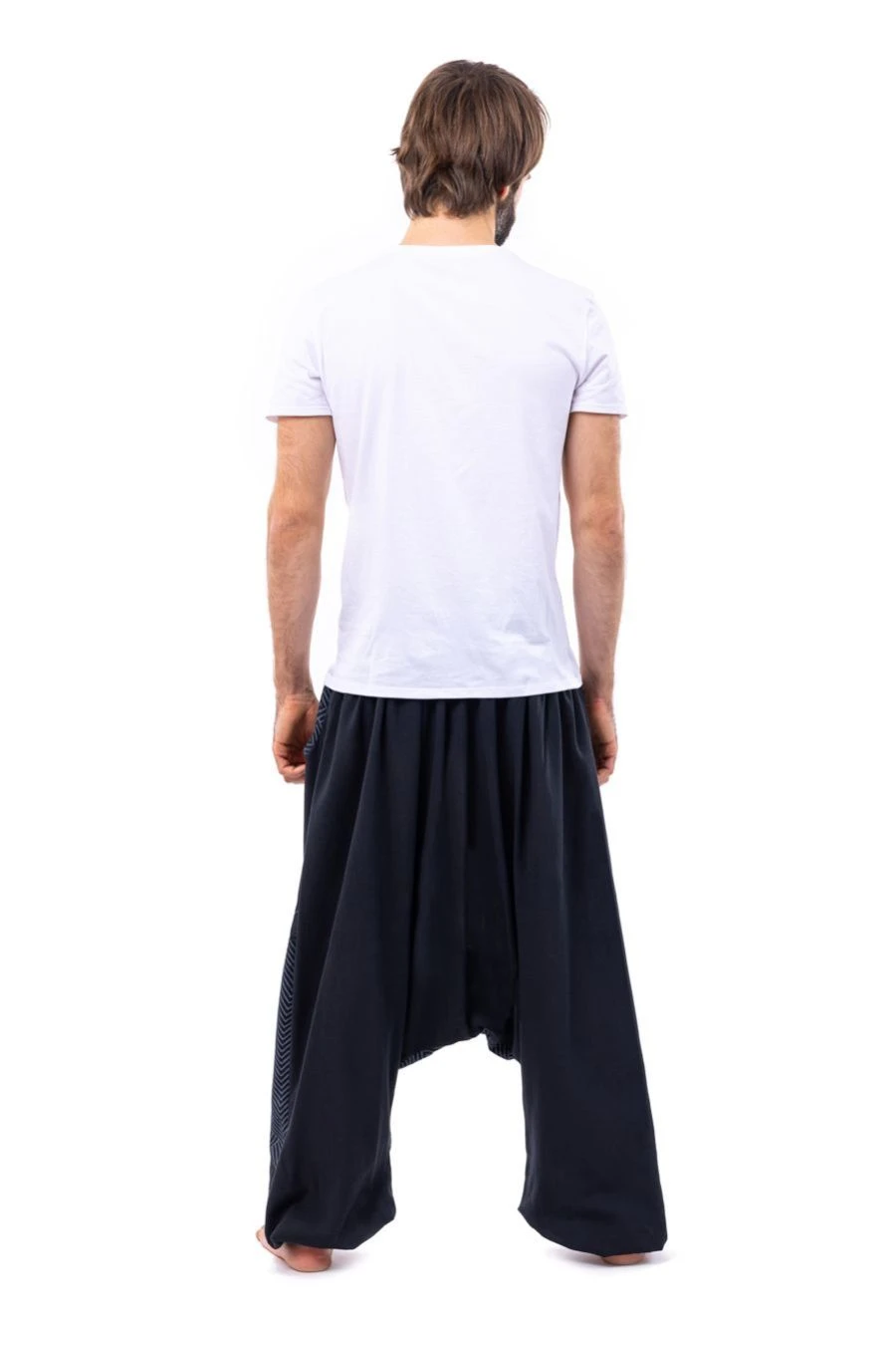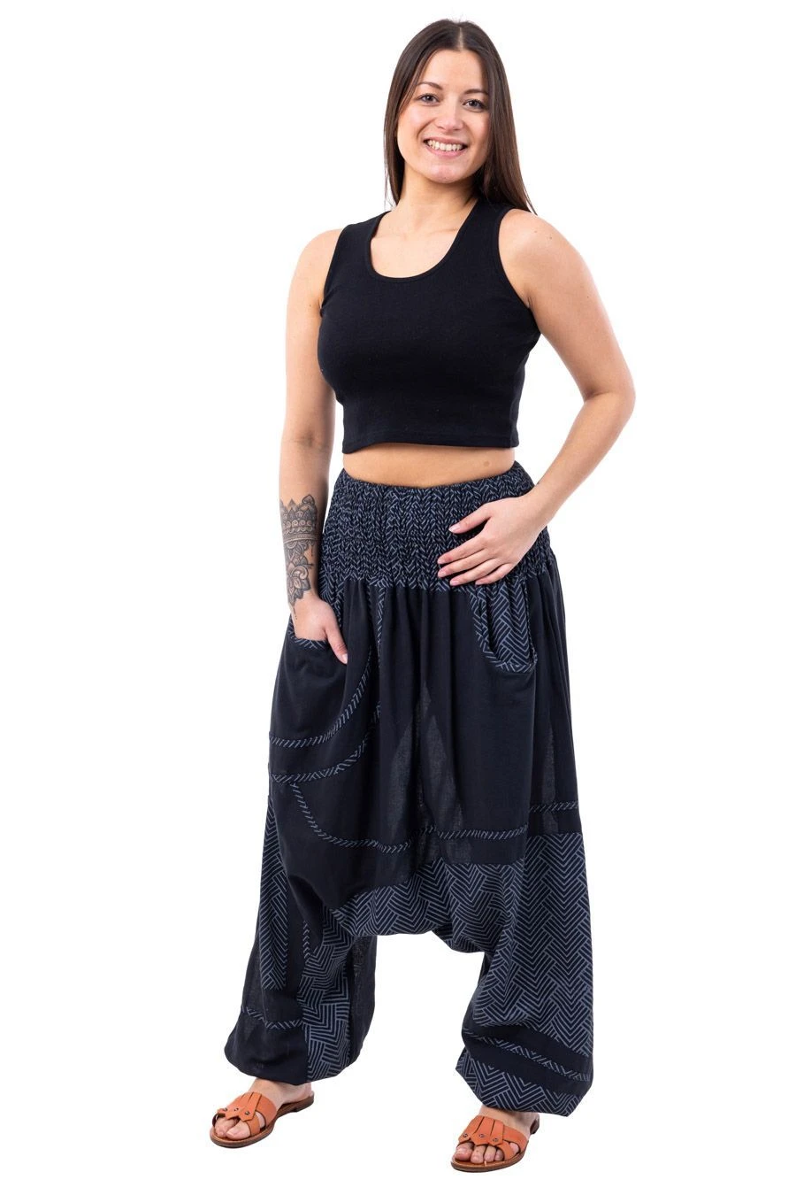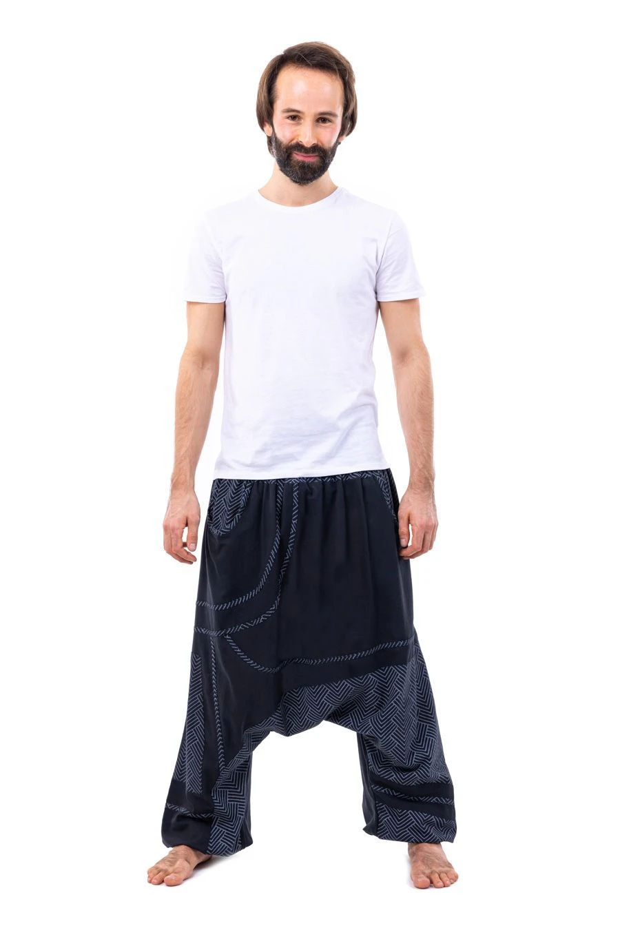 Nos mannequins photos : Carolane – 1,67m avec le DĂ©bardeur crop-top cĂ´telĂ© Raven en taille M, et JĂ©rĂ©my – 1,75m – portent habituellement les sarouels en taille M (36-38).