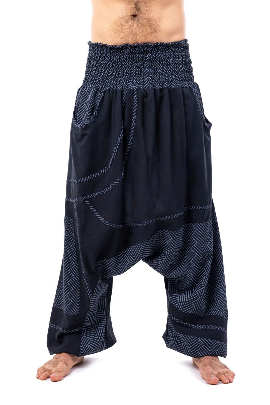 Imprimé géométrique à la touche rétro intemporelle pour rythmer ce sarouel mixte confortable et généreux. Large ceinture bandeau élastique à porter haut sur la taille ou pour accueillir un ventre rond (grand confort pour les femmes enceintes), taille basse sur les hanches ou même remontée en combi-bustier pantacourt.