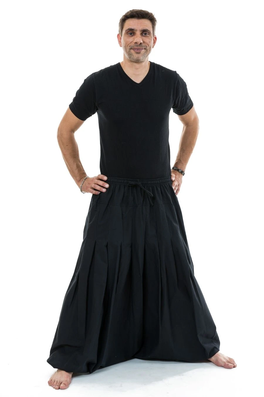 Pantalon sarwel ultra ample à fourche extra basse style jupe longue fermée en bas. Le + : peut être transformé selon vos envies en remontant les chevilles élastiquées.