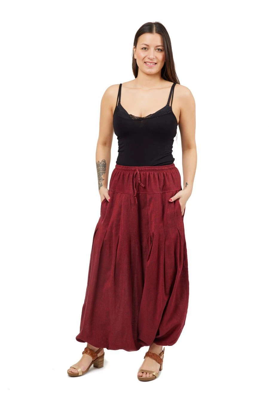 Sarouel gender neutral à fourche extra basse style jupe longue fermée en bas. Une amplitude ultra confortable, un design travaillé avec un jeu de plis plats, il peut être transformé selon vos envies en remontant les chevilles élastiquées, pour des journées zen décontractées.