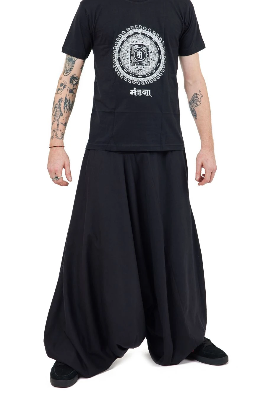 Nos mannequins photos, Luccia – 1,64m – et Youri – 1,75m – portent le big sarouel en taille M (36-38).