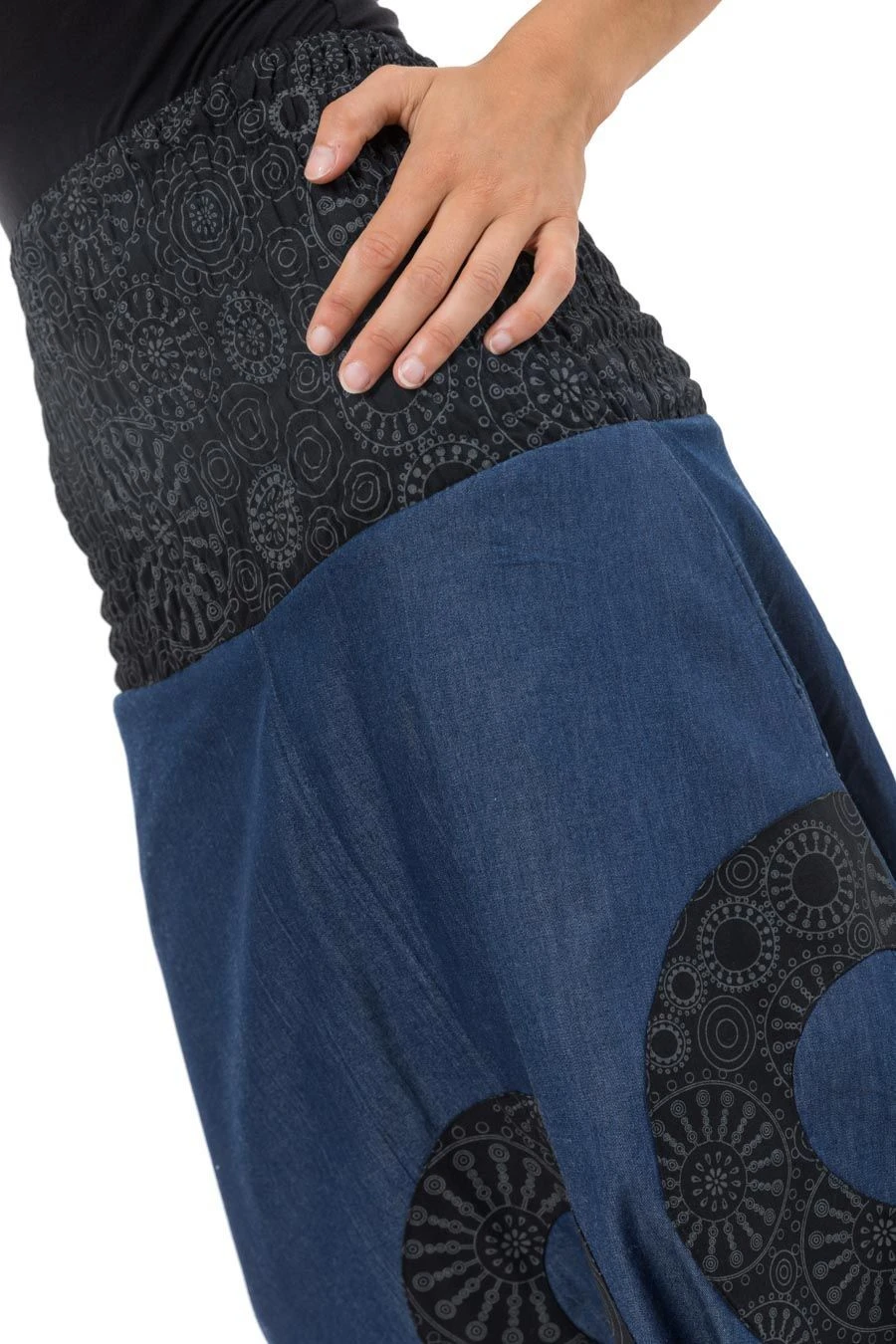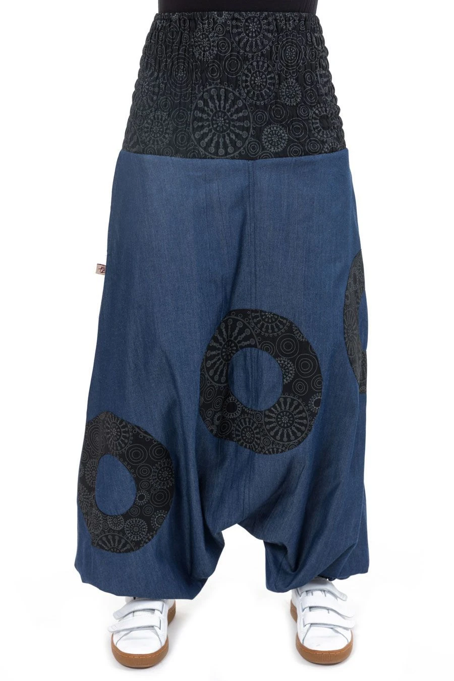 Sarouel jean denim ceinture elastique imprime cercle Tirkha – FZ2830 – 100% pur jean denim du Népal.