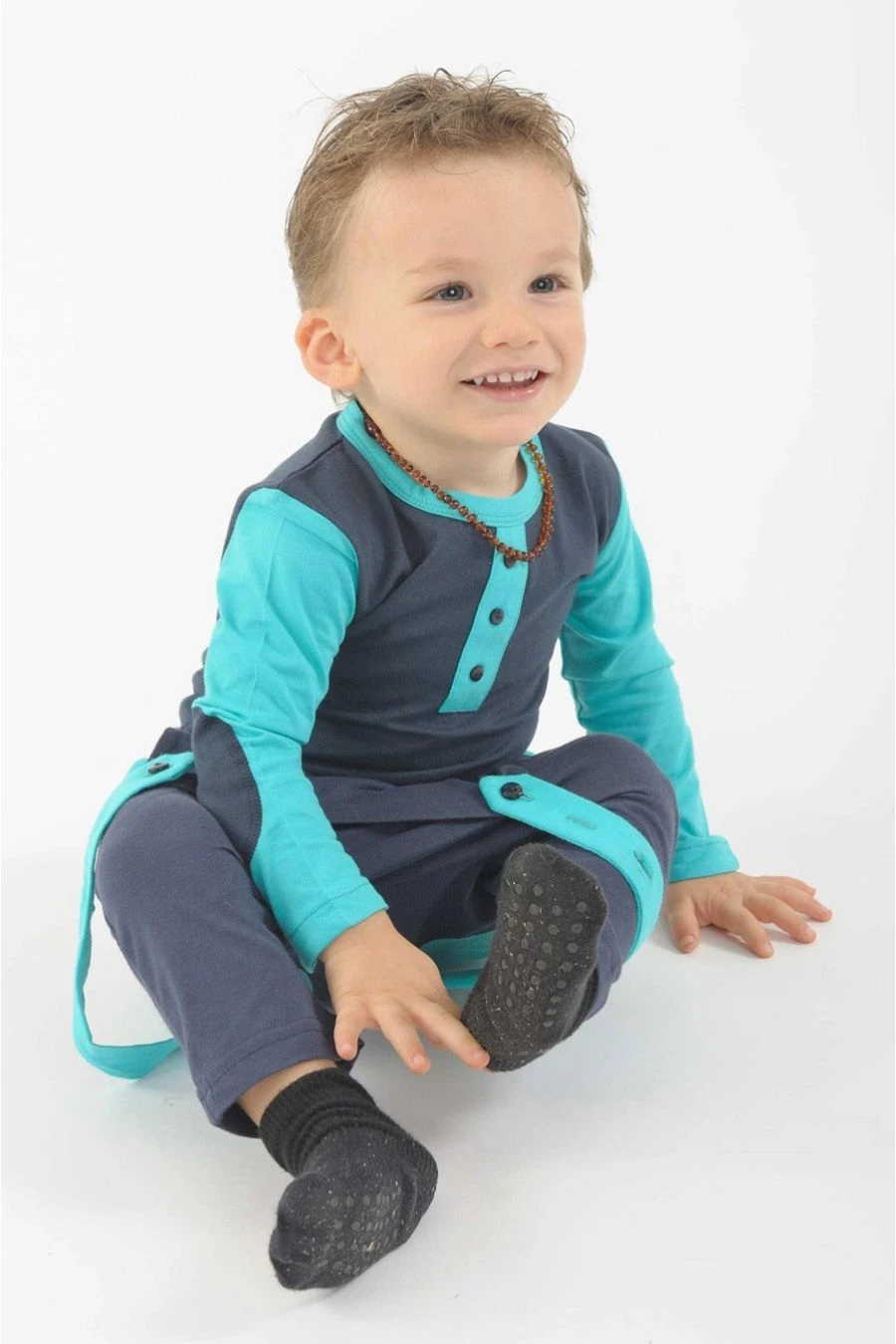 Col rond (1 bouton de chaque cĂŽtĂ© uniquement pour la taille 12 mois pour faciliter l’habillage) – 3 petits boutons dĂ©co devant – CoudiĂšres patch.